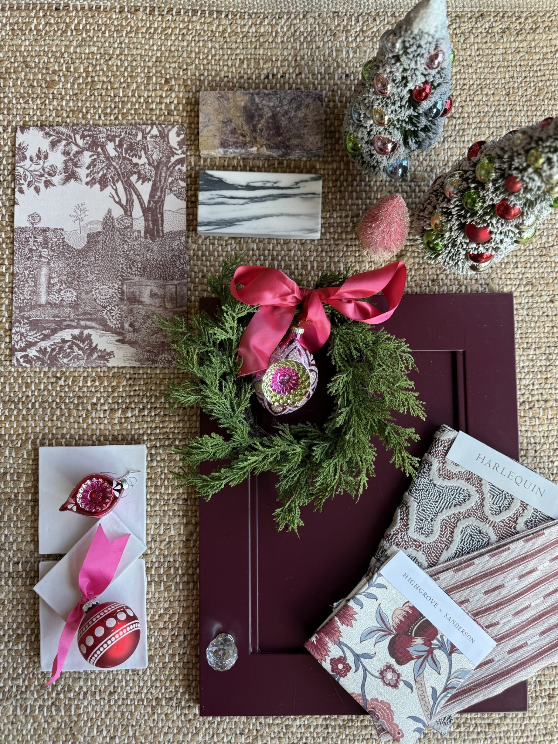 Styled with petite evergreen wreaths wrapped in satin bow, hand-blown ornaments, and sparkling bottle-brush trees, the palette becomes a whole holiday moment. The burgundy grounds everything — the toile scenes, the marbled stone, the soft pinks and blushes — creating a feeling that’s traditional but never tired.